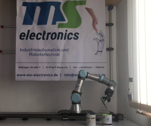 1 / 3Roboter legt Kugelschreiber in Tassen