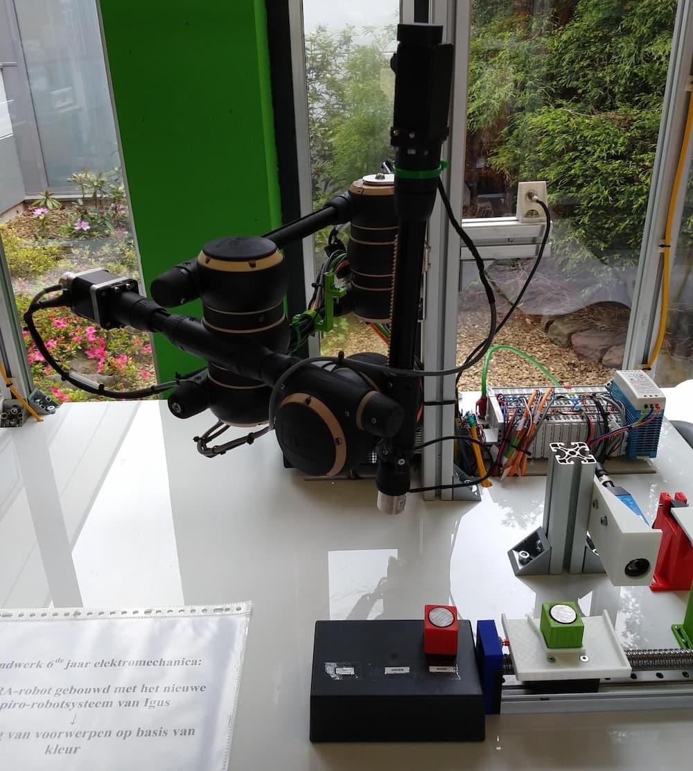 Students from Provinciale School Diepenbeek built a low cost sorting system with a scara robot built with Apiro parts from igus. The robot is controlled with a Beckhoff-PLC and is using a visual recognition system.